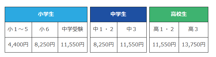 | 高校3年生 | 4,400円 | 5,500円 | 7,700円 |